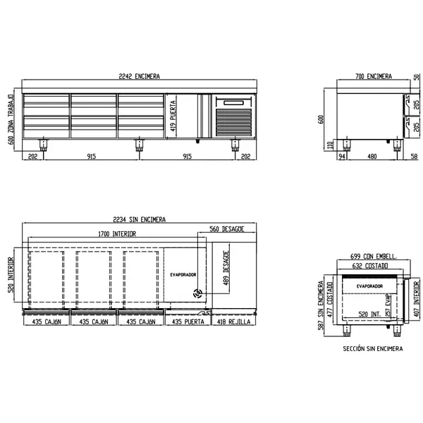 Koelwerkbank | 700 RANGE | Laag Model | 359L | 1 Deur + 6 Laden (1/1 GN) | -2°C/+8°C | Geforceerd | Temperatuuralarm | 2245x700x600(h)mm