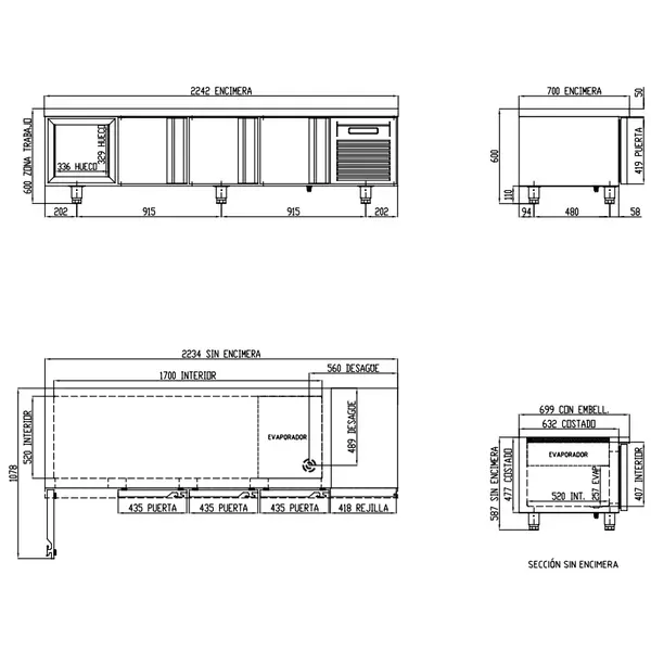 Koelwerkbank | 700 RANGE | Laag Model | 359L | 4 Deuren (1/1 GN) | -2°C/+8°C | Geforceerd | Temperatuuralarm | 2245x700x600(h)mm
