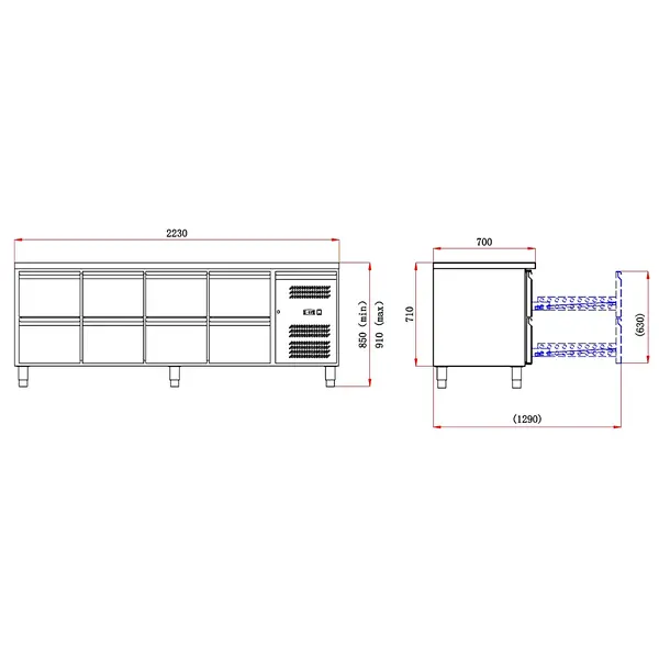 Koelwerkbank | STANDARD LINE | 553L | 8 Laden (1/1 GN) | +2°C/+8°C | Geforceerd | 2230x700x850(h)mm