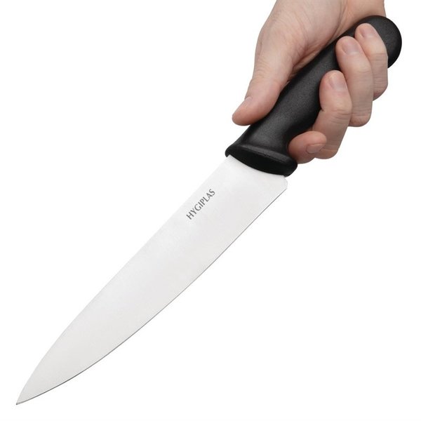 Goede kwaliteit messen van Hygiplas. Vaatwasserbestendig en eenvoudig te slijpen, met zwart nylon heft voor een comfortabele grip. Dit koksmes is ideaal voor algemeen gebruik, zoals het hakken, fijnhakken en snijden van vlees en groenten.