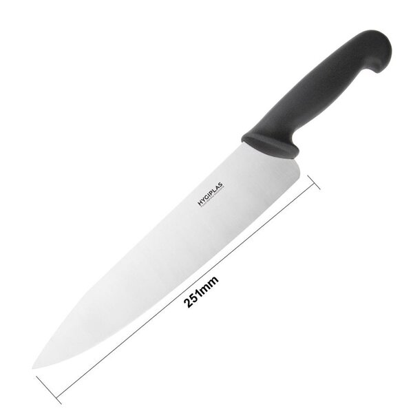 Bereid jouw voedsel moeiteloos en snij met gemak door producten met het Hygiplas zwarte koksmes. Met professionele resultaten bij elke snede, snijdt het brede lemmet gemakkelijk door de moeilijkste groenten, fruit of vlees. Het roestvrijstalen lemmet is zeer duurzaam en bestand tegen roest, chemische corrosie en stootschade.