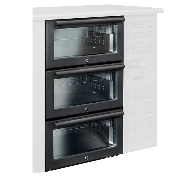 Deze ladenset, bestaande uit 3 gelijke laden met glazen voorzijde, is speciaal geschikt voor de Diamond BOTTLES EVO serie barkoelkasten en kan worden gemonteerd ter vervanging van 1 van de deuren.