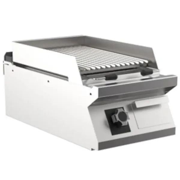 De grill is uitgerust met duurzame branders van RVS en beschikt over thermokoppels en een waakvlam voor een veilige en betrouwbare werking. De compacte afmetingen van 400 mm breed, 750 mm diep en 250 mm hoog maken dit apparaat geschikt voor professioneel gebruik in verschillende horecagelegenheden.