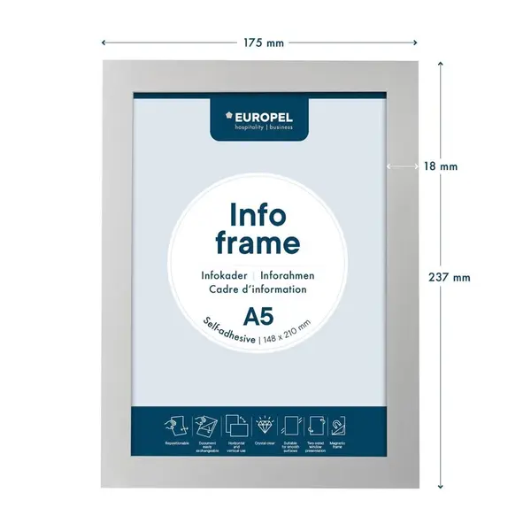 Met de Europel magnetische wissellijsten presenteer je informatie op een duidelijke en professionele manier. Deze set bevat twee wissellijsten en is ideaal voor gebruik in kantoren, winkels en openbare ruimtes. De lijsten zijn beschikbaar in verschillende formaten die dankzij het strakke ontwerp en een framebreedte van 18 mm zorgen ze voor een verzorgde uitstraling.