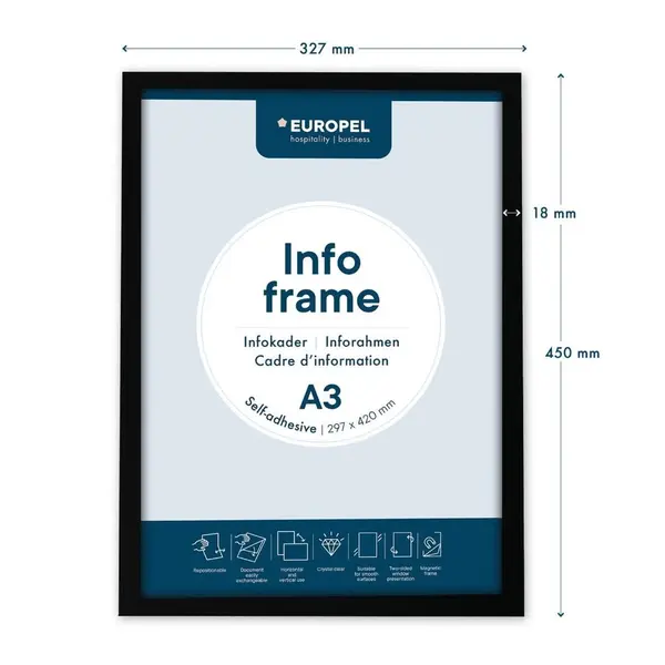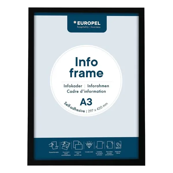 Met de Europel magnetische wissellijsten presenteer je informatie op een duidelijke en professionele manier. Deze set bevat twee wissellijsten en is ideaal voor gebruik in kantoren, winkels en openbare ruimtes. De lijsten zijn beschikbaar in verschillende formaten die dankzij het strakke ontwerp en een framebreedte van 18 mm zorgen ze voor een verzorgde uitstraling.