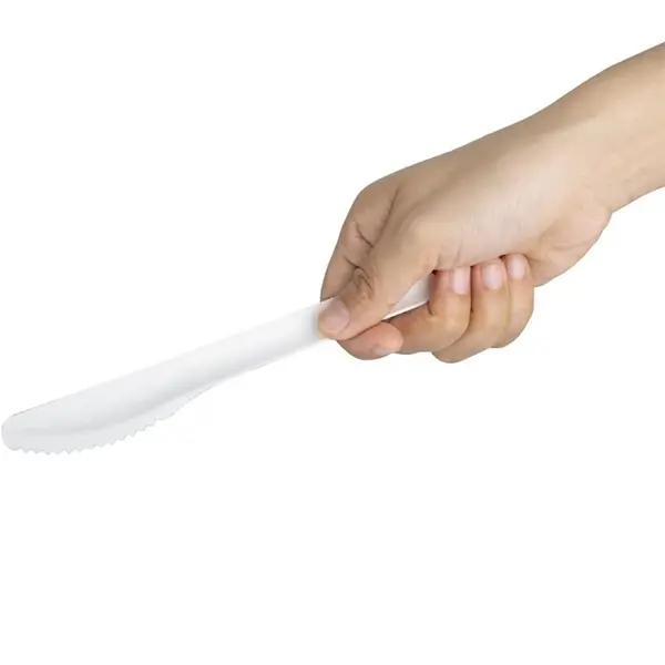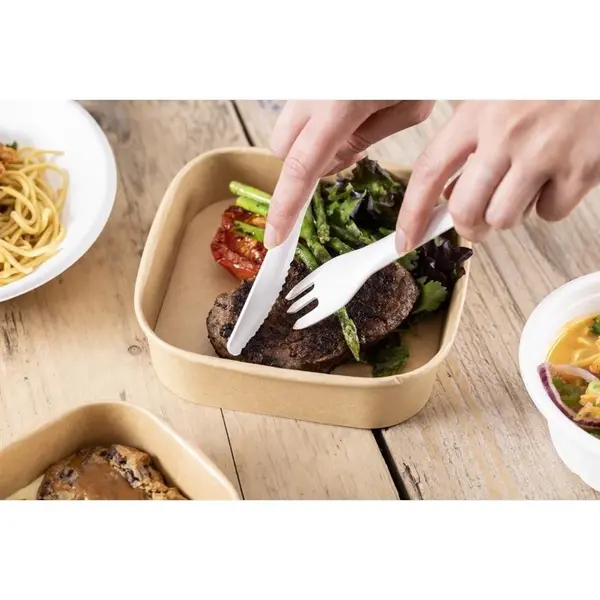 De Fiesta Recyclable composteerbare papieren messen bieden een sterk en milieuvriendelijk alternatief voor wegwerpplastic. Elk mes is 165 mm lang en gemaakt van duurzaam papier, ideaal voor klanten die houten bestek niet prettig vinden. De messen zijn EN13432-gecertificeerd voor commercieel composteerbaar gebruik, waardoor ze na gebruik verantwoord verwerkt kunnen worden. Ze worden geleverd in een handige dispenserdoos met 100 stuks, waardoor aanvullen eenvoudig is. Dit product vormt een uitstekend groen alternatief voor zowel plastic als houten wegwerpbestek.