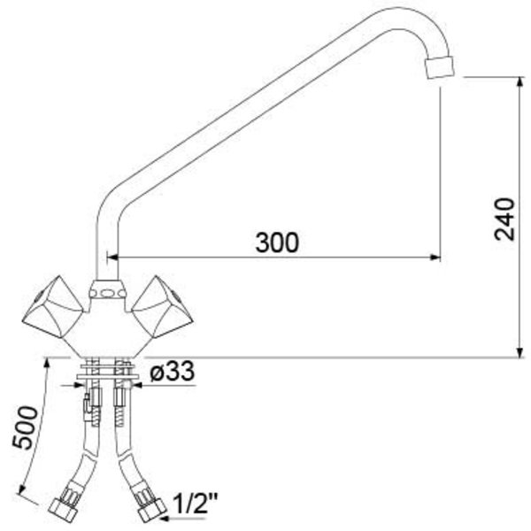 Diameter tafelopening Ø 33 mm. Lengte uitloop 300 mm. Hoogte uitloop 240 mm. Aansluiting 1/2". Lengte aansluiting 500 mm. Inclusief flexibele slang CNS DN8 aansluitingen 1/2" L 500 mm.