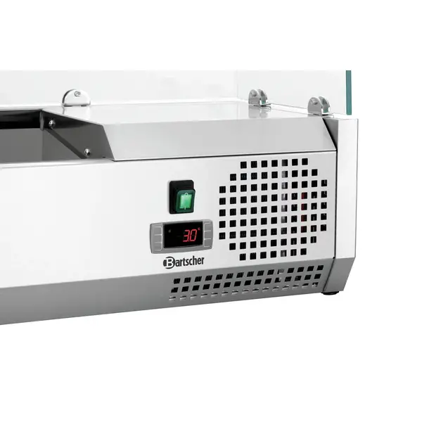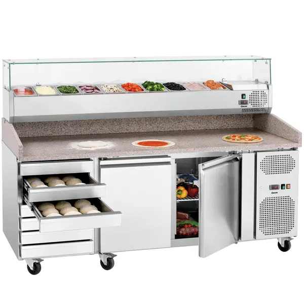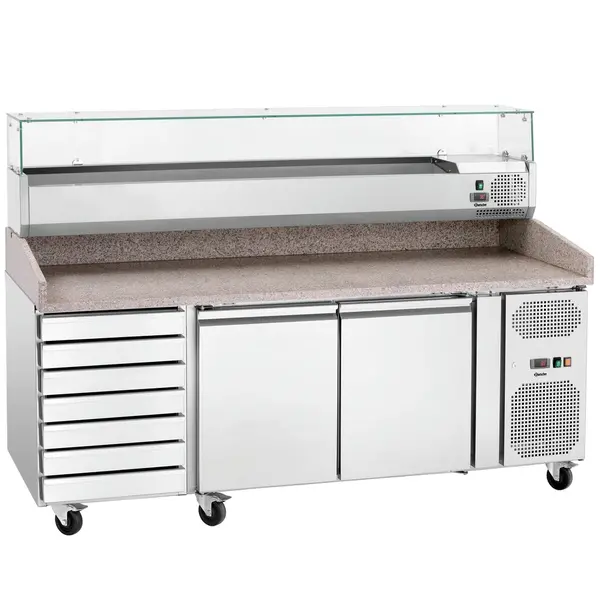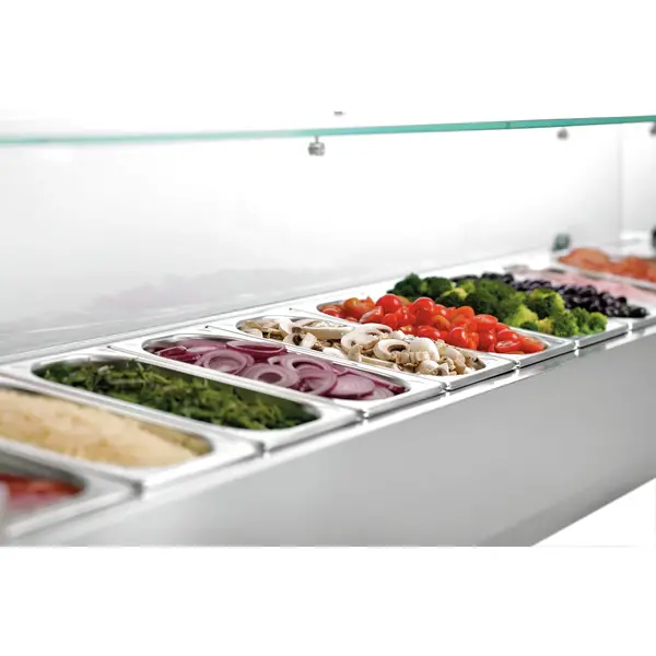 Met ruimte voor maximaal 10x 1/4 GN-containers is de GL3-2005-koelopzetvitrine met glazen opzetelement de perfecte aanvulling op de G-S7T2-pizzakoeltafel.