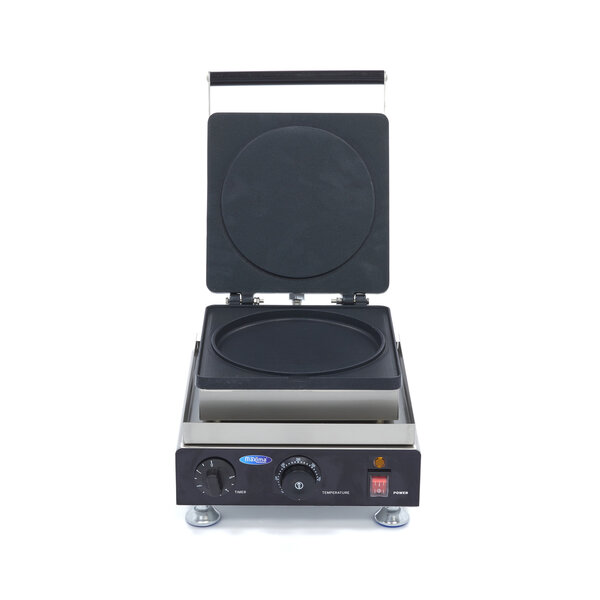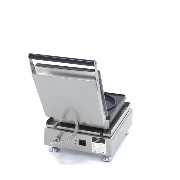Met deze elektrische pannenkoekmaker maak je snel en eenvoudig mooie, ronde pannenkoeken met een diameter van 215 mm. De dubbele bakplaat met anti-aanbaklaag zorgt voor een snelle productie en een robuuste werking. De pannenkoekmaker is voorzien van een variabele thermostaat tot 300 graden Celsius en een timer, waardoor je de baktijd nauwkeurig kunt instellen. Het indicatielampje geeft aan wanneer het apparaat op temperatuur is. De stevige handgreep en uitneembare lekbak maken het gebruik praktisch en hygiënisch. De buitenzijde is gemaakt van roestvrij staal, wat zorgt voor een duurzaam en gemakkelijk schoon te maken ontwerp. Het apparaat staat stabiel op vier RVS-voeten en is geschikt voor gebruik in onder andere oud-Hollandse gebakkramen, markten en braderieën.
