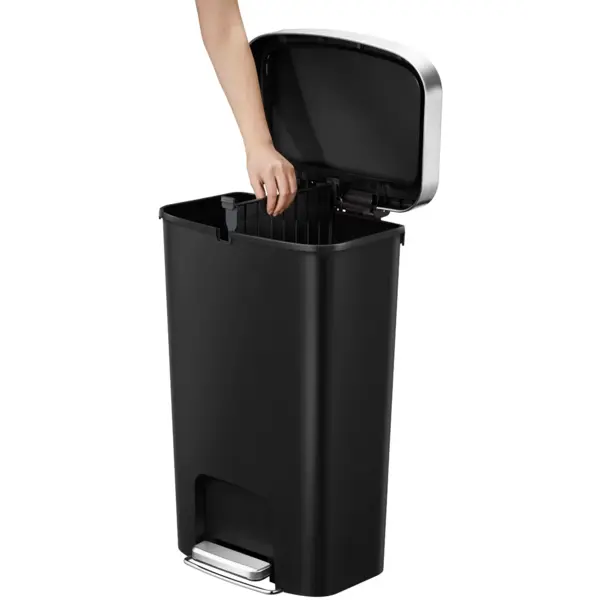 Het gedempt sluitende deksel zorgt voor gecontroleerd en stil sluiten. De brede, overlappende rand houdt de afvalzak stevig op zijn plaats en uit het zicht. Daarnaast kun je de bak volledig openzetten, wat het reinigen en wisselen van de afvalzak vereenvoudigt. Dankzij de ingebouwde wielen aan de achterzijde verplaats je de pedaalemmer eenvoudig wanneer nodig.