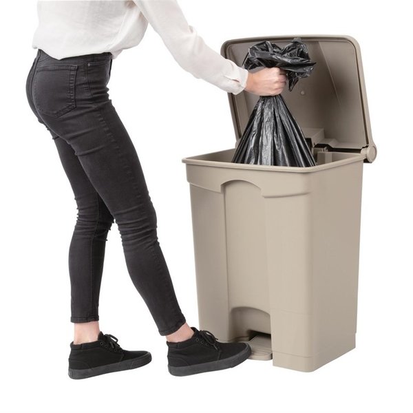 Deze beige 65 liter Jantex pedaalemmer heeft een kunststof constructie die ervoor zorgt dat de afvalbak lang meegaat en de luchtdichte deksel minimaliseert onaangename geurtjes in de keuken. Dankzij het voetpedaal hoeft je personeel niet hun handen te gebruiken om de deksel te openen en dit helpt de verspreiding van bacteriën tegen te gaan zodat de omgeving gezond en hygiënisch schoon blijft. Door de haken is het makkelijk de vuilniszakken te vast te maken.