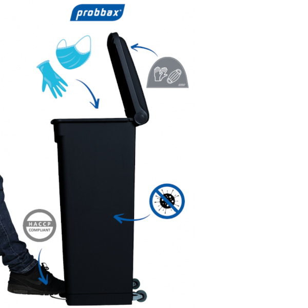 De Probbax® afvalbakken uit deze speciale antibacteriële serie zijn robuust en makkelijk schoon te maken en desinfecteren (in lijn met HACCP-procedures). Het stevige kunststof (70% gerecycled) is voorzien van een antibacteriële werkzame stof die de verspreiding van bacteriën en microben stopt. Onderaan deze pagina vind je meer informatie over de antibacteriële werking.