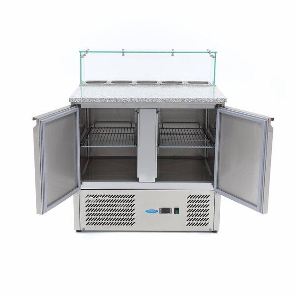 Deze robuuste pizzawerkbank is ideaal voor het bereiden van verse pizza's in de horecakeuken. Het granieten werkblad biedt een stevige en hygiënische werkplek, terwijl de praktische opzetkoelvitrine zorgt dat alle ingrediënten binnen handbereik zijn. De koelvitrine is geschikt voor vijf 1/6 GN-bakken en wordt geleverd met RVS-steunen. De roosters zijn in hoogte verstelbaar en de temperatuur is digitaal instelbaar tussen 0 en 10 graden Celsius. Dankzij de ventilatorkoeling blijft de temperatuur gelijkmatig verdeeld en wordt ijsvorming verminderd door een unieke koelcyclus. De pizzawerkbank is vervaardigd uit roestvrij staal en glas, wat het schoonmaken eenvoudig maakt. Het apparaat werkt met het milieuvriendelijke koelmiddel R600a en is voorzien van een beschermende isolatielaag en een Zanussi compressor.