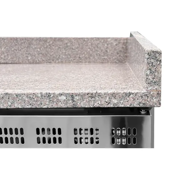 Deze professionele pizzawerkbank van UNNICOOL met euronorm/bakerynorm interieur (EN600x400) heeft een robuuste behuizing en binnenkant in RVS en granieten werkblad, wat het apparaat samen met de krachtige geforceerde koeling bijzonder geschikt maakt voor intensief professioneel gebruik.