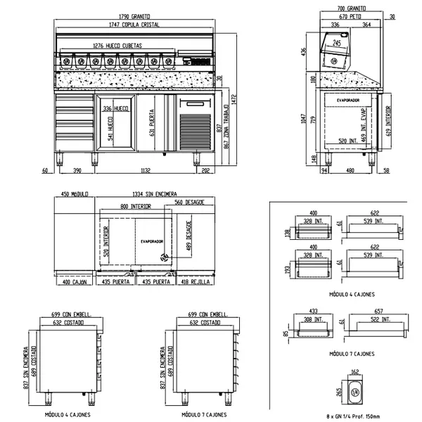 GN-ruimte boven: 8x 1/4 GN (≤ H 150 mm)