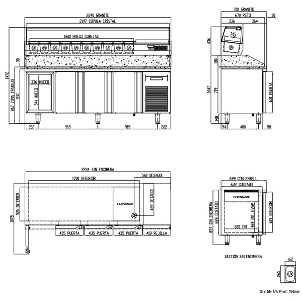 Pizzawerkbank + Opzetkoelvitrine | 700 RANGE | 543L | 4 Deuren (1/1 GN) | Boven 10x 1/4 GN | 0°C/+8°C | Geforceerd | Temperatuuralarm | 2245x700x850/1472(h)mm