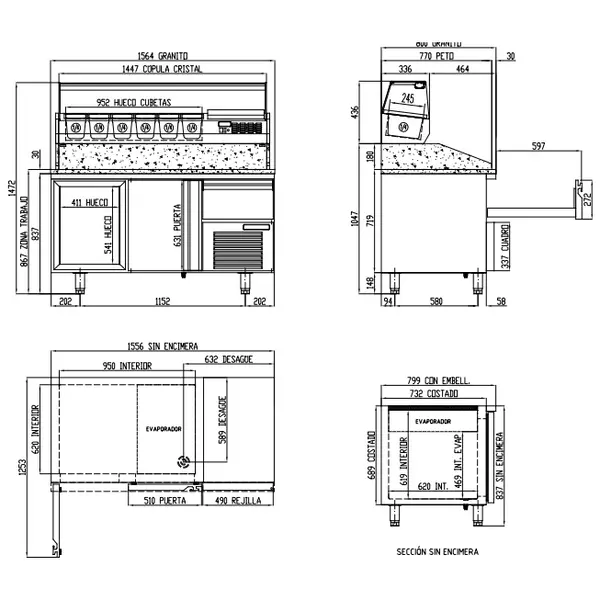 De binnen- en buitenzijde zijn uitgevoerd in AISI-304 RVS (behalve achterzijde), met afgeronde hoeken voor optimale hygiëne. De deuren zijn voorzien van een zelfsluitend systeem, omkeerbare scharnieren en magnetische sluiting. De meegeleverde opzetkoelvitrine bovenop is voorzien van een glasopzet zodat er geen stof of ander vuil in kan vallen. De pizzawerkbank heeft bovendien een neutrale deeglade voor pizzadeeg, en de in hoogte aanpasbare roosters (niet meegeleverd) zorgen voor flexibiliteit in gebruik.