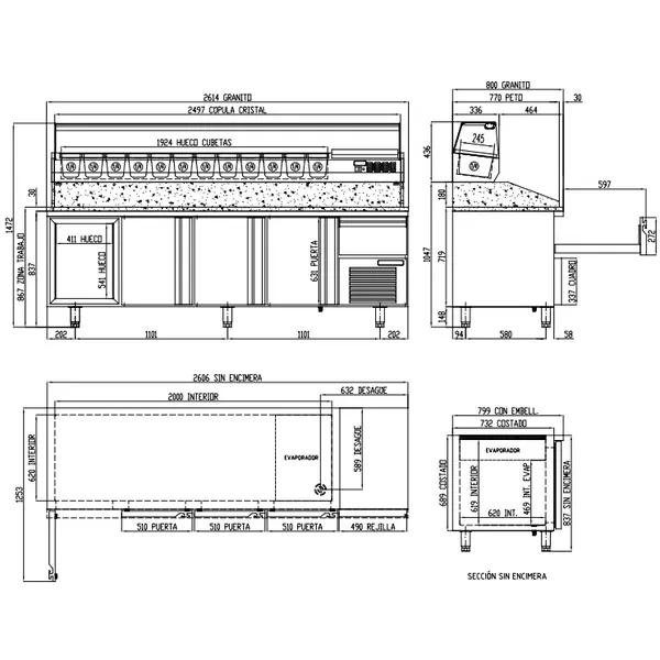 De binnen- en buitenzijde zijn uitgevoerd in AISI-304 RVS (behalve achterzijde), met afgeronde hoeken voor optimale hygiëne. De deuren zijn voorzien van een zelfsluitend systeem, omkeerbare scharnieren en magnetische sluiting. De meegeleverde opzetkoelvitrine bovenop is voorzien van een glasopzet zodat er geen stof of ander vuil in kan vallen. De pizzawerkbank heeft bovendien een neutrale deeglade voor pizzadeeg, en de in hoogte aanpasbare roosters (niet meegeleverd) zorgen voor flexibiliteit in gebruik.