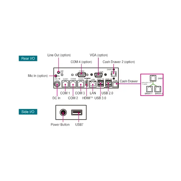 Voor randapparatuur biedt het systeem uitgebreide connectiviteit met onder meer seriële poorten, USB, HDMI, LAN en andere aansluitingen. Dankzij deze veelzijdige aansluitmogelijkheden kun je eenvoudig scanners, printers, displays of andere kassacomponenten toevoegen en het systeem volledig afstemmen op jouw verkooppunt.