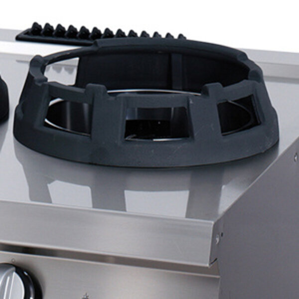 Deze professionele wokbrander op gas is ontworpen om de smaak en vitamines van ingrediënten optimaal te behouden tijdens het roerbakken of wokken. De wokbrander heeft ruimte voor twee wokpannen en is voorzien van duurzame gietijzeren kookringen die geschikt zijn voor zware belasting. Met een diepte van 900 mm biedt deze wokbrander voldoende ruimte voor grote wokpannen. De uitneembare lekbak aan de onderkant vangt vet op en is eenvoudig te reinigen. De bovenkant is gemaakt van roestvrij staal, wat het schoonmaken vergemakkelijkt. De brander is uitgerust met een waakvlam, een veiligheidsklep met thermokoppel en een veiligheidsthermostaat. Deze wokbrander werkt op zowel LPG als aardgas en is geschikt voor plaatsing in een bakwand, baklijn, of als compact tafelmodel.
