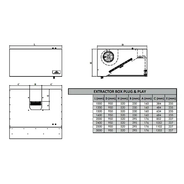 Deze UNNINOX Plug&Play afzuigkap in doosmodel, met diepte van 950 mm, is uitgevoerd in geborsteld RVS en beschikt over een interne motor met capaciteit tot 1500 m³/u.