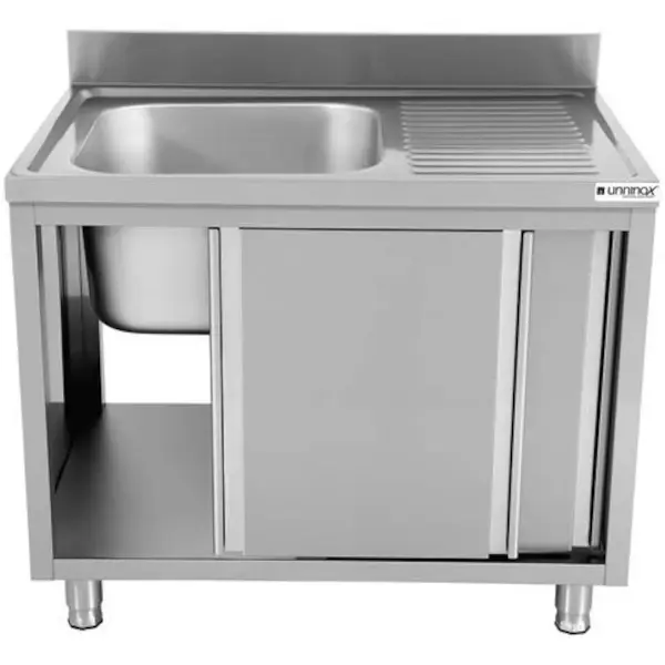 RVS spoeltafel met achteropstand | 1 spoelbak links - druipvlak rechts | 2 schuifdeuren | 1200x700x850(h)mm