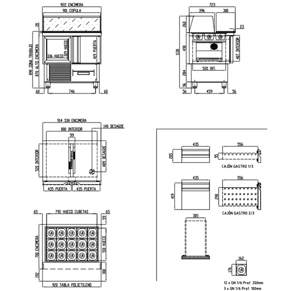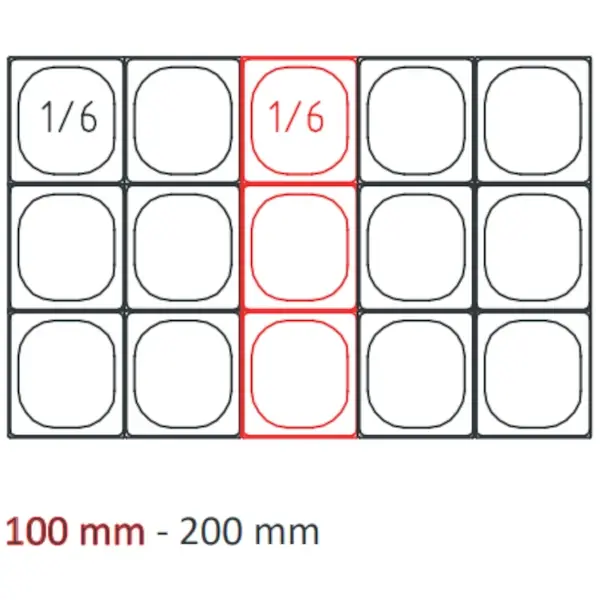 GN-ruimte boven: 15x 1/6 GN (≤ H 100/200 mm)