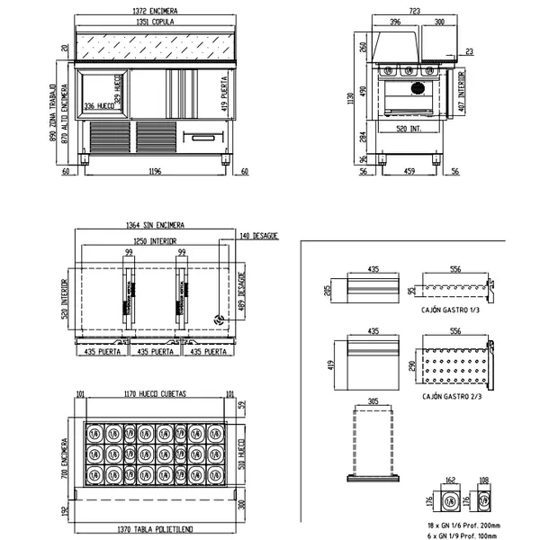 De binnen- en buitenzijde zijn uitgevoerd in AISI-304 RVS, met afgeronde hoeken voor optimale hygiëne. De deuren zijn voorzien van een zelfsluitend systeem, omkeerbare scharnieren en magnetische sluiting. De GN-ruimte bovenop is voorzien van een glasopzet zodat er geen stof of ander vuil in kan vallen, en het werkblad is voorzien van een uitschuifbaar snijblad voor extra werkruimte. De verstelbare poten en in hoogte aanpasbare roosters zorgen voor flexibiliteit in gebruik.
