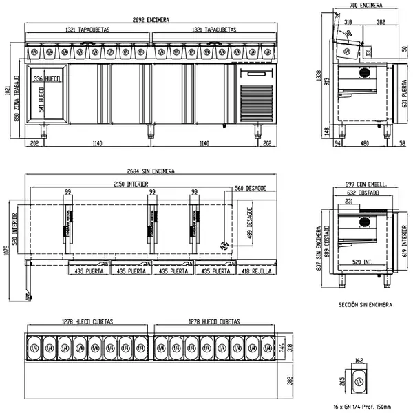 GN-ruimte boven: 16x 1/4 GN (≤ H 150 mm)