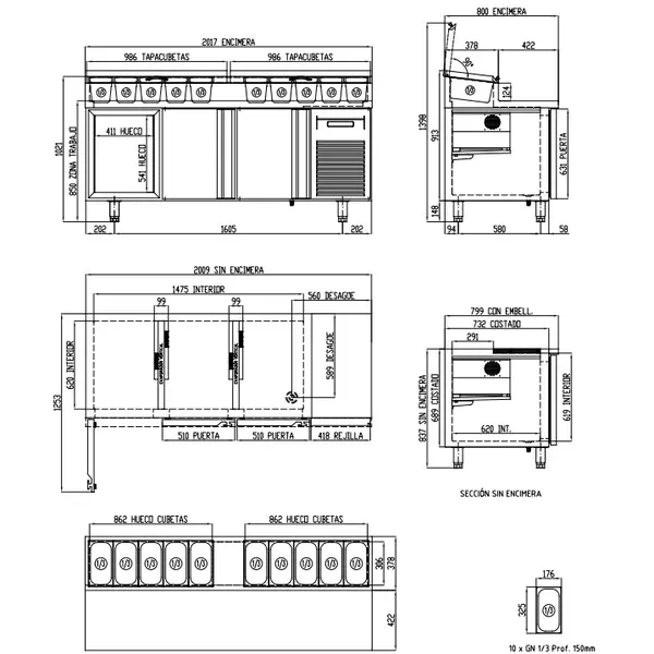 GN-ruimte boven: 10x 1/3 GN (≤ H 150 mm)