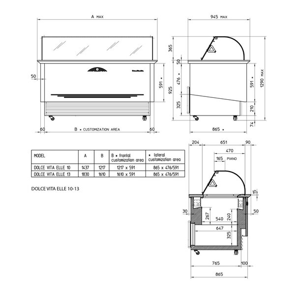 De DOLCE VITA ELLE vitrines zijn beschikbaar met een displayruimte met ruime capaciteit voor 10 of 13 standaard 5 liter ijsuitschepbakken (los verkrijgbaar). Direct daaronder is ruimte om reservevoorraad op dezelfde temperatuur te bewaren, welke zowel bereikbaar is via de bovenkant als via een speciaal (zelfsluitend) deurtje aan de bedieningskant.