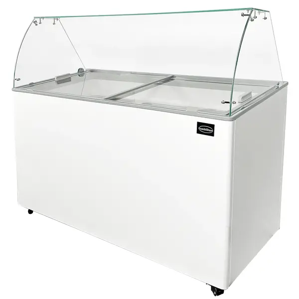 De schepijsvitrine beschikt over een frame waar 8 standaard 5 liter ijsuitschepbakken in kunnen worden geëtaleerd (los verkrijgbaar) en daaronder is ruimte om reservevoorraad op dezelfde temperatuur te bewaren. Deze gekoelde reserve is zowel bereikbaar via de bovenkant als via een speciaal deurtje aan de bedieningskant, wat samen met de standaard wielen voor extra gebruiksgemak en flexibiliteit zorgt.