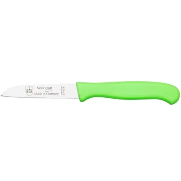 Het SOLINGEN RVS schilmes met groen heft heeft een RVS lemmet van 75 mm en is geschikt voor nauwkeurig schil- en snijwerk. Dankzij de HACCP-kleurcodering (groen = groente & fruit) gebruik je dit mes hygiënisch in professionele keukens. Een praktisch en betrouwbaar mesje voor dagelijks gebruik in jouw professionele keuken.