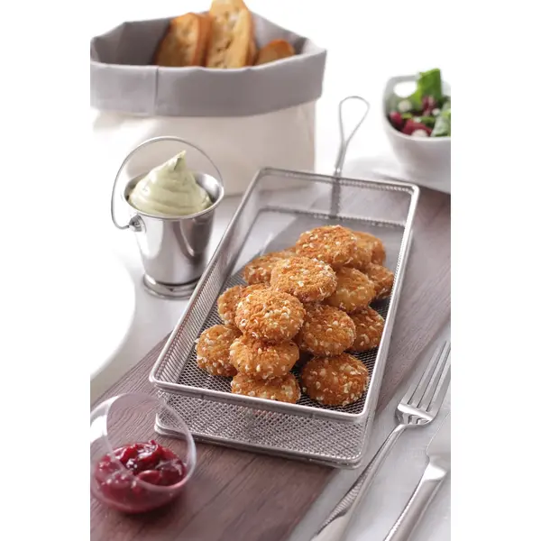 Deze HENDI serveermand van hoogwaardig RVS is ideaal voor het serveren van frietjes, snacks en andere gefrituurde gerechten. Het duurzame materiaal is bestand tegen dagelijks gebruik en behoudt zijn glans en kwaliteit. Het praktische ontwerp maakt de mand eenvoudig te hanteren en zorgt voor een nette en aantrekkelijke presentatie, zowel in professionele keukens als thuis.