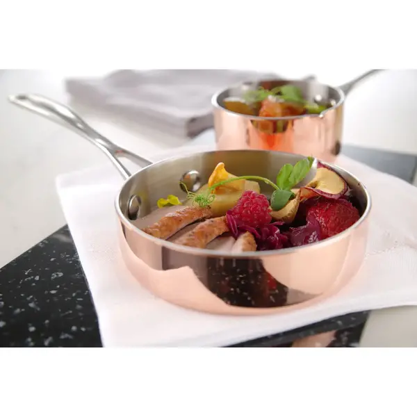 Dit HENDI serveerpannetje is vervaardigd uit een duurzame 3-laags constructie van koper, aluminium en hoogwaardig RVS, wat zorgt voor een stevige en betrouwbare serveeroplossing. Perfect voor het presenteren en serveren van snacks, hapjes en andere gerechten.