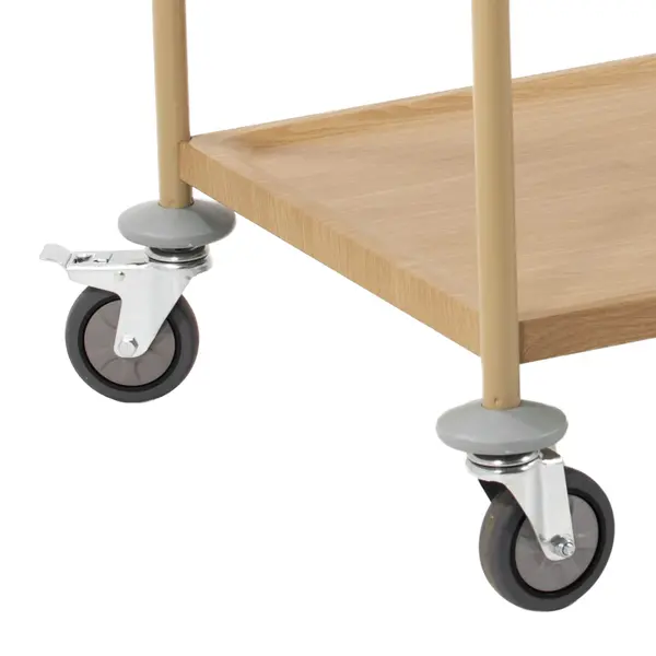 De serveerwagen is gemaakt van hoogwaardig RVS met beige epoxygelakte buizen en niveaus met houtlook afwerking. De wagen is eenvoudig te monteren en de geremde zwenkwielen zijn voorzien van stootringen, voor veilig en comfortabel gebruik.