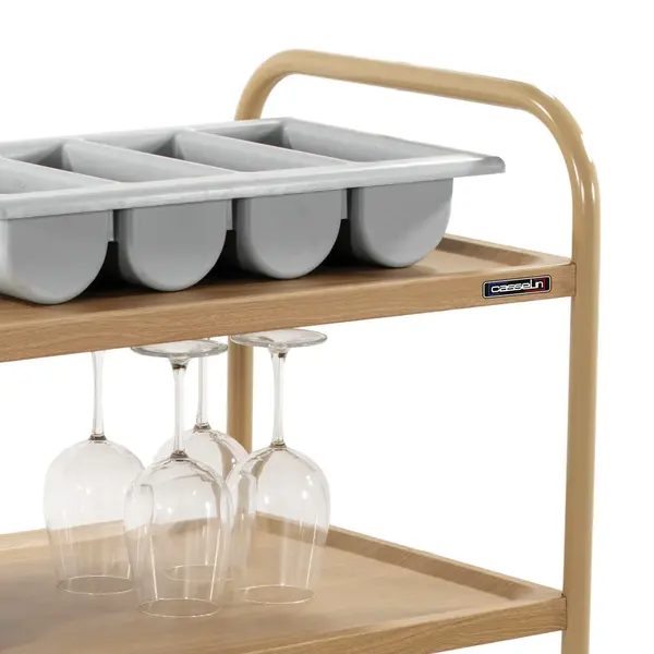 De serveerwagen is gemaakt van hoogwaardig RVS met beige epoxygelakte buizen en niveaus met houtlook afwerking. De wagen is eenvoudig te monteren en de geremde zwenkwielen zijn voorzien van stootringen, voor veilig en comfortabel gebruik.