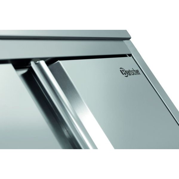 - Voeten van vierkante buis 40x40mm, schappen aan elke kant met 40mm omgevouwen rand en met dwarsbalk verstevigd, Scotch Bride gepolijst