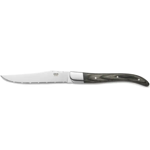 De steakmessen van het merk CARLOS combineren een krachtige uitstraling met een warme, natuurlijke look dankzij de grijze pakkahouten handgreep. Het ontwerp zorgt voor een stevige grip en past goed bij zowel informele als professioneel gedekte tafels.