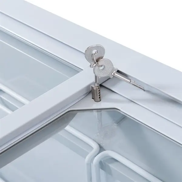 De afsluitbare schuifdeksels bieden extra beveiliging van de inhoud. De vrieskist is voorzien van zware zwenkwielen, waardoor verplaatsen en positioneren eenvoudig is, bijvoorbeeld voor reiniging. De meegeleverde manden zorgen voor een georganiseerde opslag en maken het selecteren van producten efficiënt en overzichtelijk.