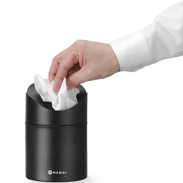 De HENDI tafelafvalbak met tuimeldeksel houdt je tafel en werkblad netjes en opgeruimd. Dankzij het compacte formaat past de bak gemakkelijk op elke tafel of werkplek, terwijl het verwijderbare tuimeldeksel het openen, legen en schoonmaken eenvoudig maakt. Gemaakt van gepoedercoat metaal, is deze tafelafvalbak duurzaam en makkelijk schoon te houden, ideaal voor zowel professionele keukens als thuisgebruik.