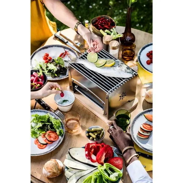 De Louis Tellier BRASERO tafelbarbecue is een innovatieve oplossing voor buitenkoken. De tafel is ontworpen om in het midden op een buitentafel te worden geplaatst en bereidt ribben, vis, spiesjes en meer, allemaal in een gemeenschappelijke barbecue in kampvuurstijl - perfect voor de heerlijkste buitenmomenten.