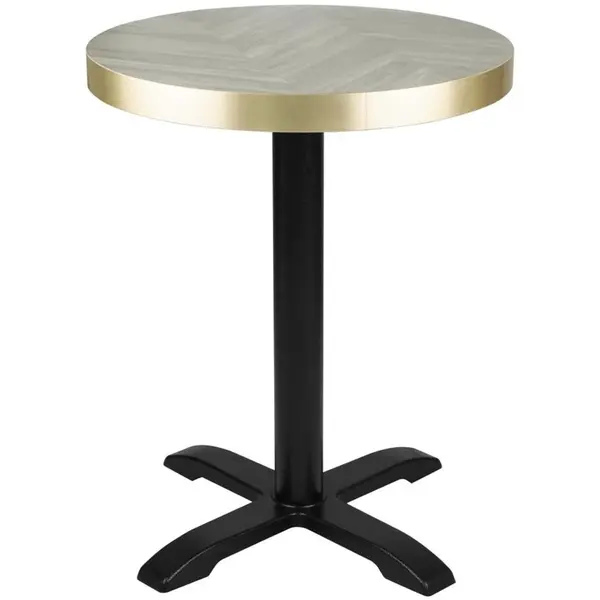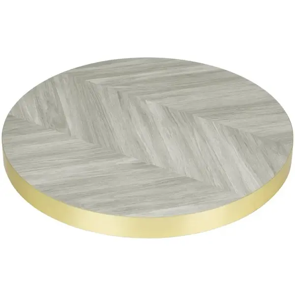 Het ronde tafelblad van Bolero combineert een opvallend design met praktische duurzaamheid en is ideaal voor horecazaken, cafés en kantoorruimtes. De levendige chevronprint in combinatie met de gouden randafwerking zorgt voor een stijlvolle en eigentijdse uitstraling die direct sfeer toevoegt aan iedere ruimte.
