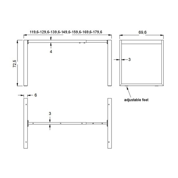 Framedoorsnede: 40 x 30 mm (verstelbare balk) / 60 x 30 mm (poten)
