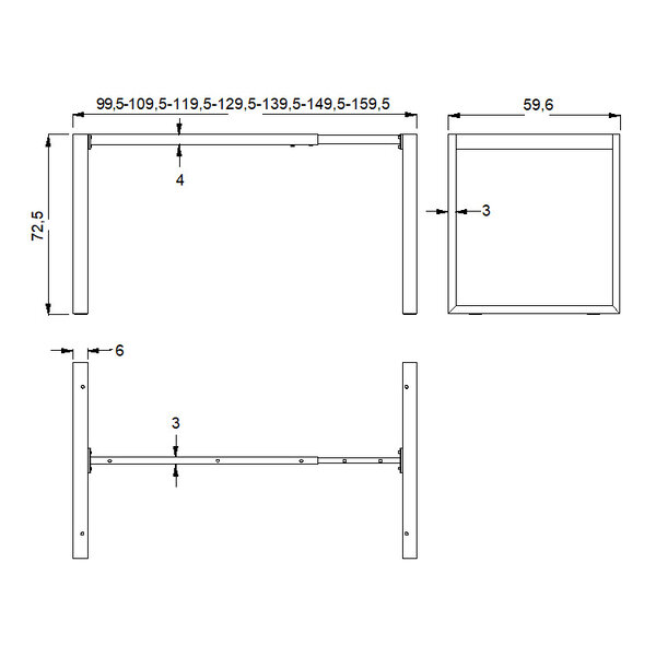 Framedoorsnede: 40 x 30 mm (verstelbare balk), 60 x 30 mm (poten)