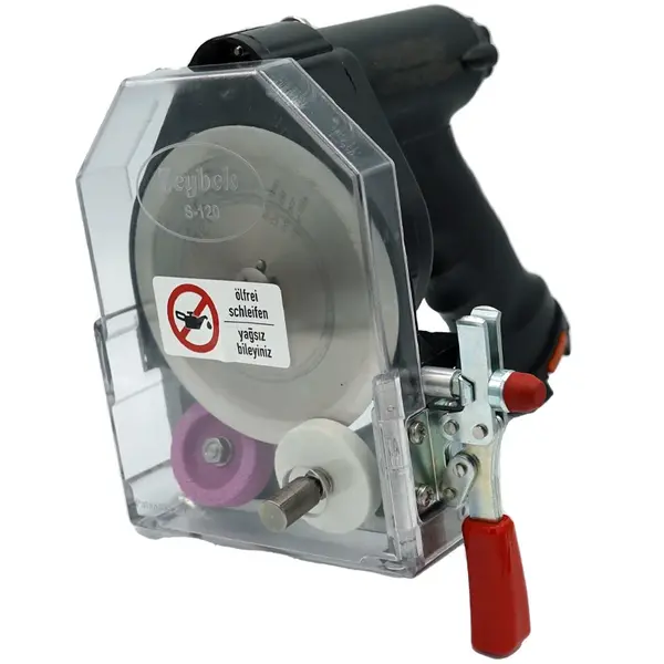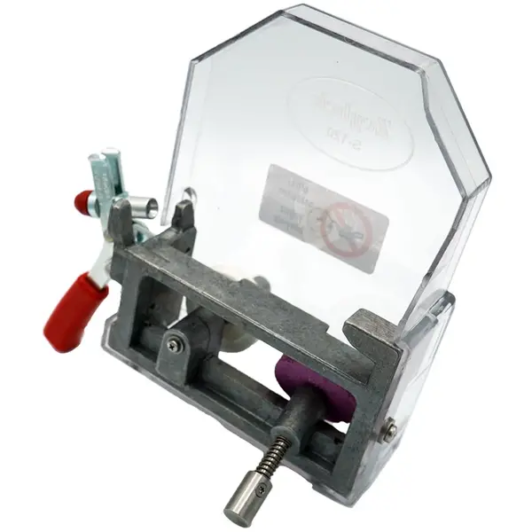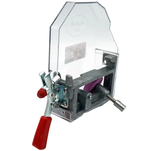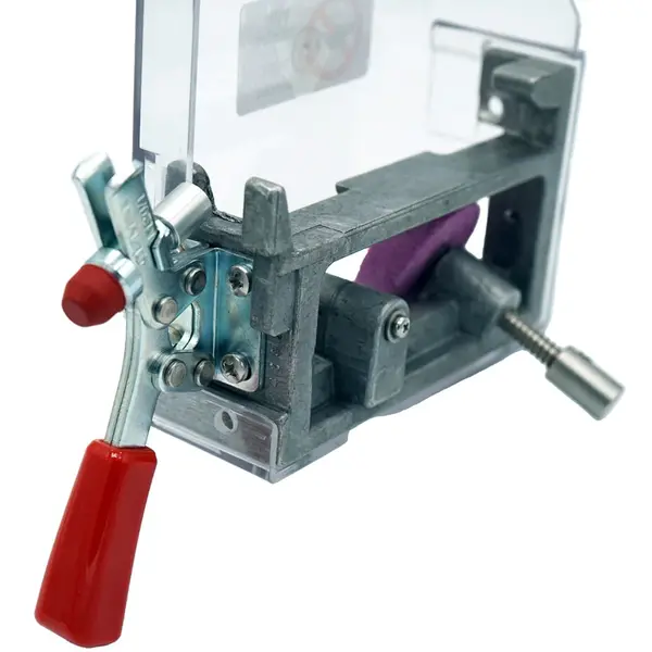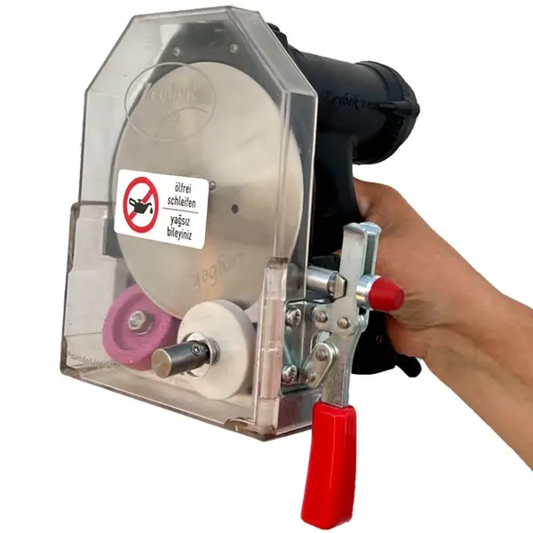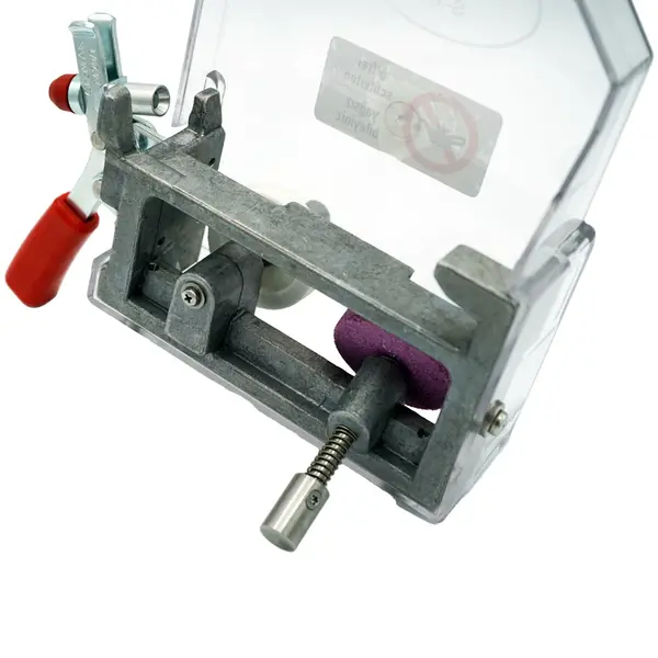 Geef uw Tandir-120 in één vlotte handeling weer een vlijmscherpe snede. De opzet-slijper klikt direct op de machine, fixeert het mes onder de perfecte hoek en slijpt razendsnel – zonder extra gereedschap.