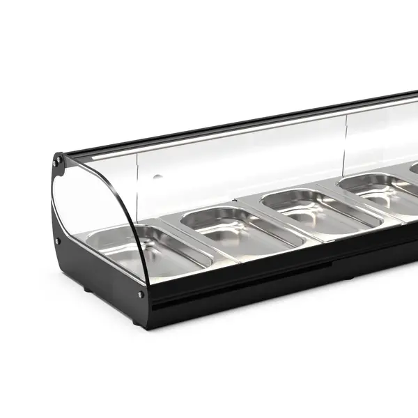 De displayruimte is afgewerkt met hoge kwaliteit gehard glas met minimale omlijsting voor optimale zichtbaarheid van alle kanten. De apart geschakelde 'High Power' LED-verlichting over de volledige breedte zorgt daarbij voor heldere belichting. Daarnaast is de bodem van deze tapasvitrine speciaal ingericht voor 1/3 GN-bakken en wordt het apparaat geleverd inclusief een complete set perfect passende RVS GN-bakken.