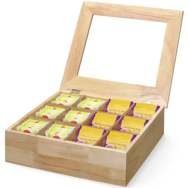 De HENDI theedoos van hout is ontworpen om de smaak en het aroma van thee optimaal te bewaren. De doos heeft 12 compartimenten, elk geschikt voor 12 theezakjes, waardoor er in totaal 144 theezakjes overzichtelijk georganiseerd kunnen worden. Het deksel is voorzien van een acryl venster en scharnieren, zodat de inhoud eenvoudig zichtbaar en toegankelijk is. Gemaakt van hout in een natuurlijke lichte tint, is deze theedoos een elegante en duurzame aanvulling op elke koffie- of theeservice in de horeca.
