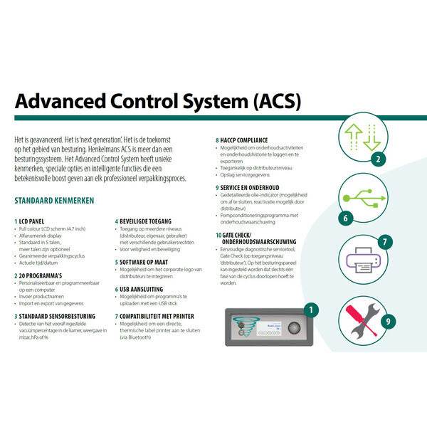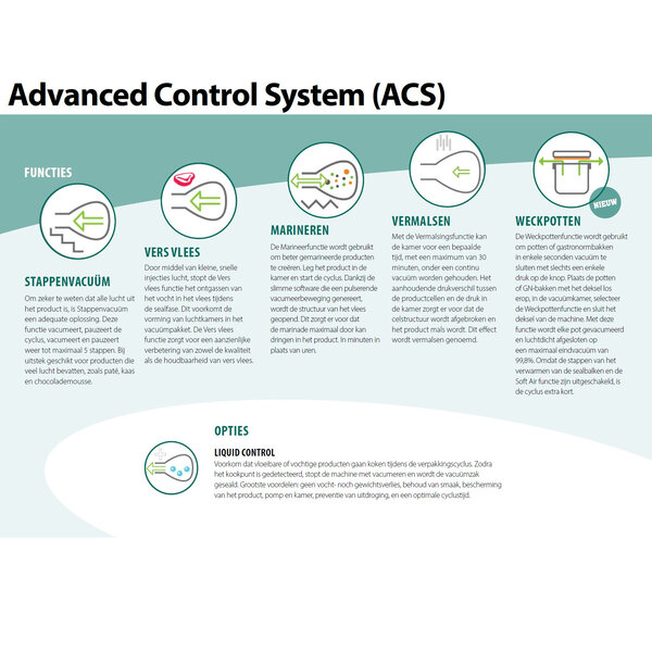De optionele ACS-besturing beschikt onder andere over standaard sensorbesturing met 20 programma's, marineerfunctie, 4,7" LCD-scherm, USB-aansluiting, toegang op meerdere niveaus, werking conform HACCP-standaarden en is geschikt voor gebruik i.c.m. de apart verkrijgbare Zebra labelprinter.