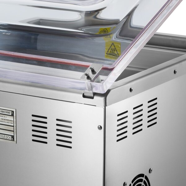 Deze vacumeermachine is een waardevolle toevoeging voor professionele keukens die grotere hoeveelheden voedsel luchtdicht willen verpakken. Dankzij de mogelijkheid om vacumeerzakken tot maximaal 40 x 50 cm te gebruiken, kun je etenswaren langer bewaren en ruimte besparen. De transparante zakken maken het eenvoudig om direct te zien wat er verpakt is, en de producten kunnen gekoeld of ingevroren worden. Het apparaat is volledig gemaakt van roestvrij staal, wat het schoonmaken vergemakkelijkt. Het bedieningspaneel is gebruiksvriendelijk en stelt je in staat om vacumeerdruk, sealtijd, temperatuur en afkoeltijd naar wens in te stellen. De machine werkt volledig automatisch en wordt geleverd met een servicepakket voor onderhoud. Dankzij de rubberen pootjes staat de machine stevig op zijn plek tijdens gebruik.